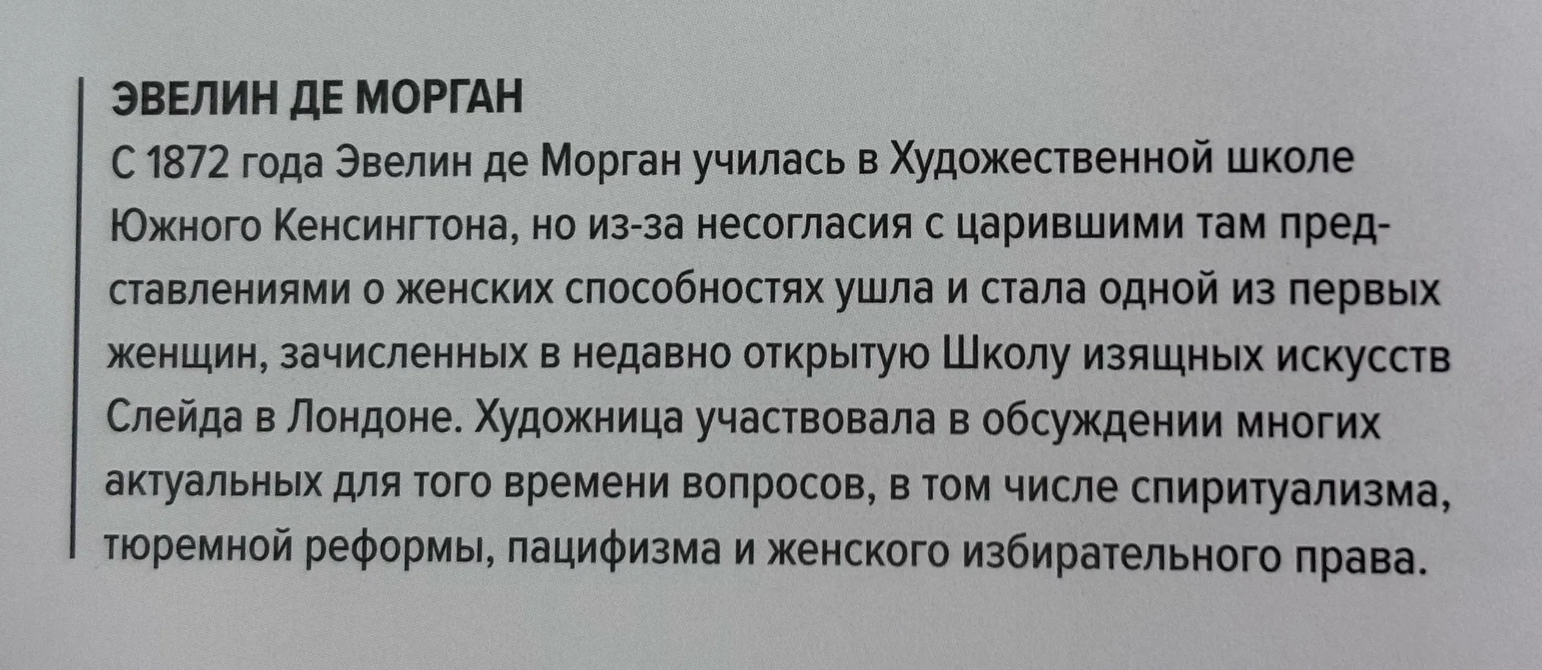 В левом нижнем углу статьи приведена короткая биографическая справка, посвящённая художнице. Из неё узнаём, что Эвелин де Морган стала одной из первых женщин, зачисленных в Школу изящных искусств Слейда в Лондоне – всемирно известное учебное заведение.