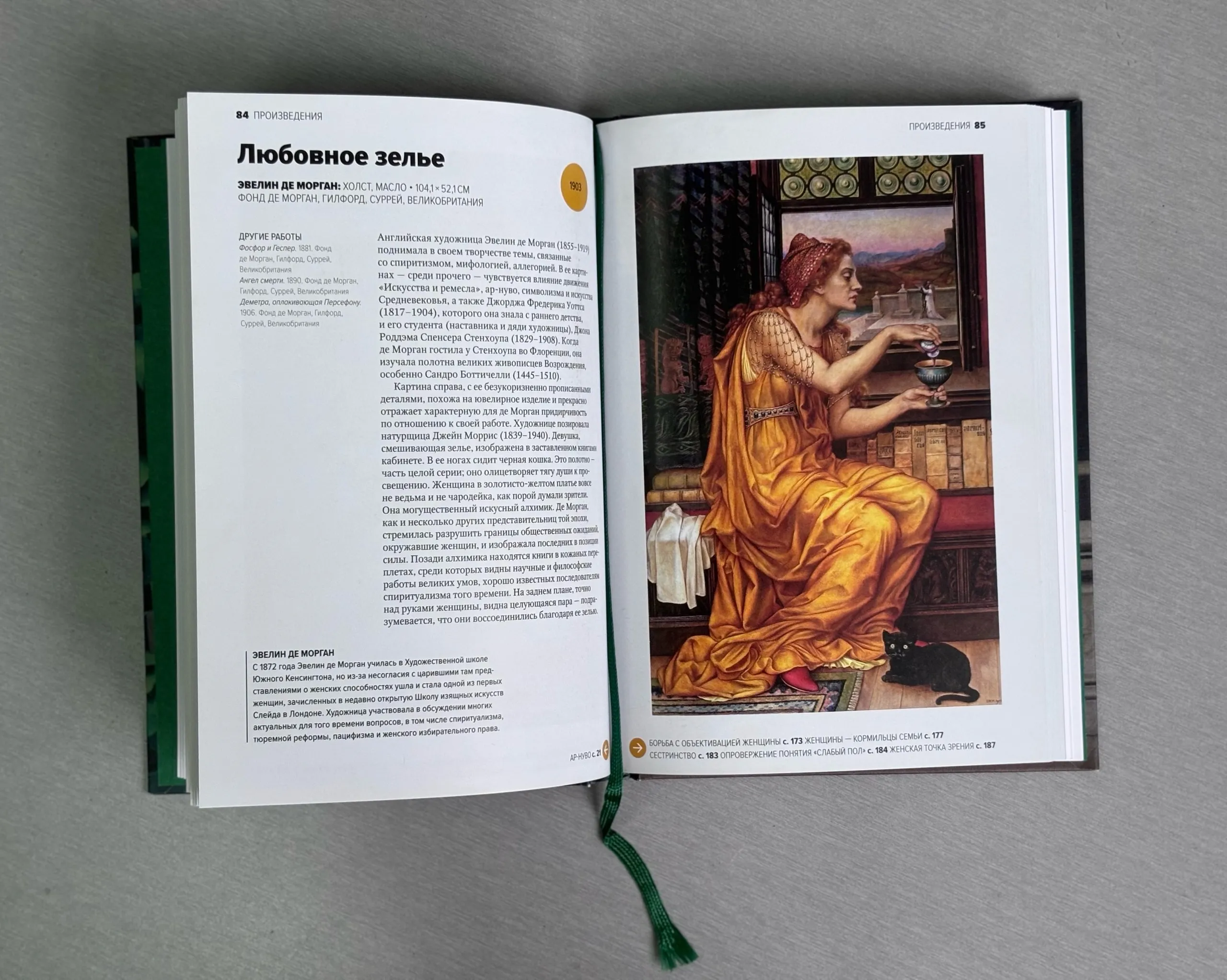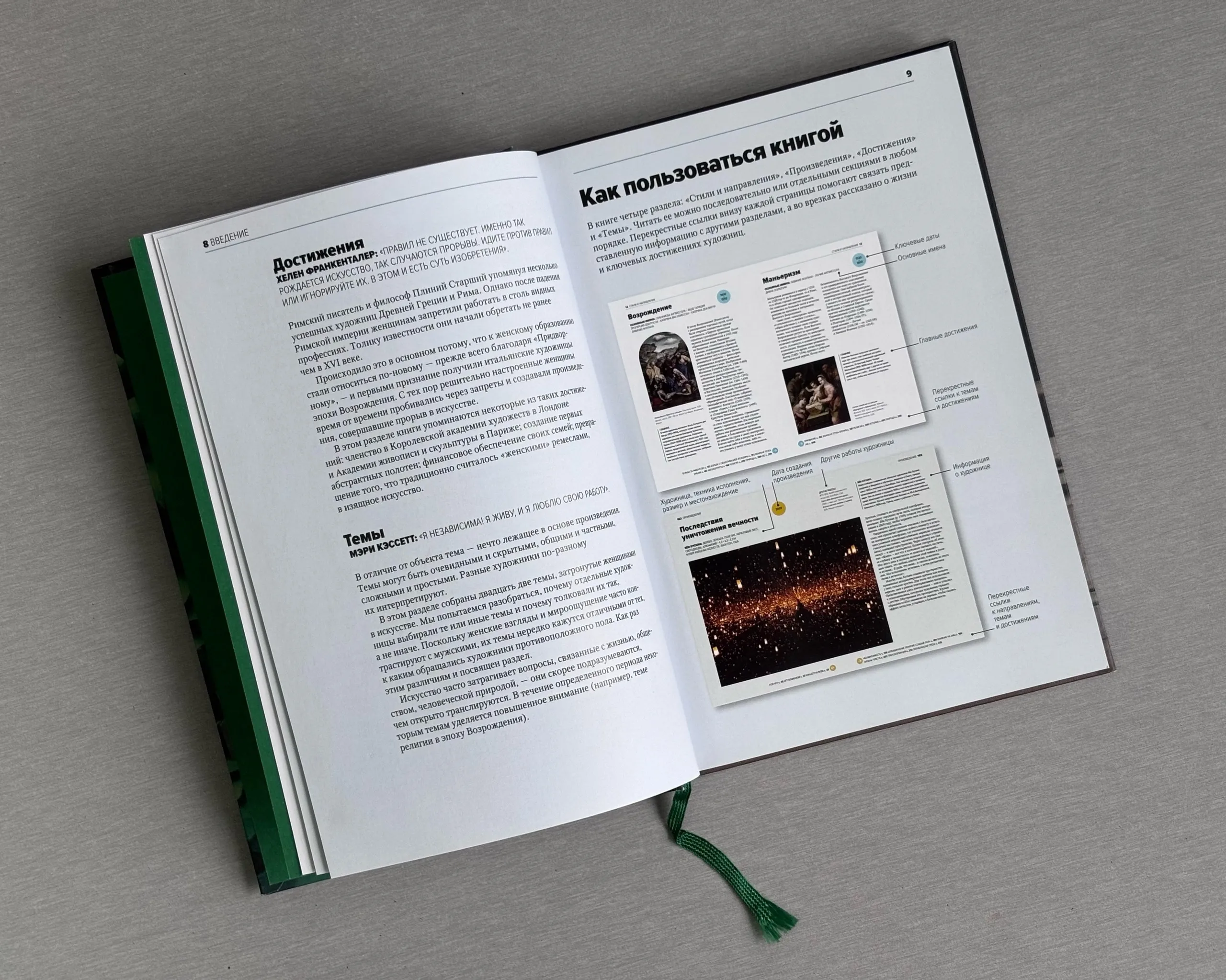 Поговорим о структуре книги. Она содержит четыре раздела: стили и направления, произведения, достижения и темы. Читать книгу можно последовательно или отдельными секциями в любом порядке. Перекрёстные ссылки внизу каждой страницы помогают связать представленную информацию с другими разделами. Во врезках рассказано о жизни и ключевых достижениях художниц. [1, с. 9]