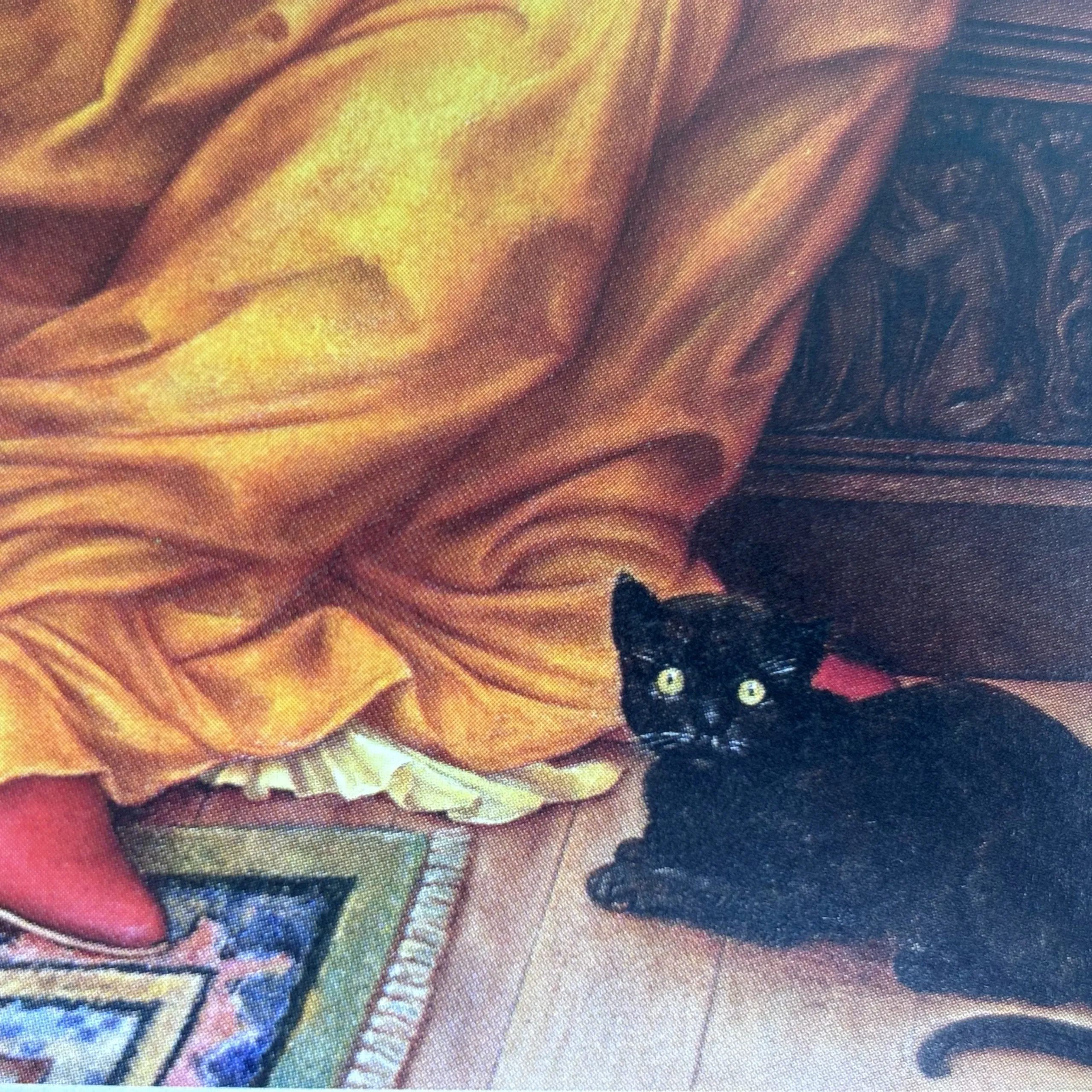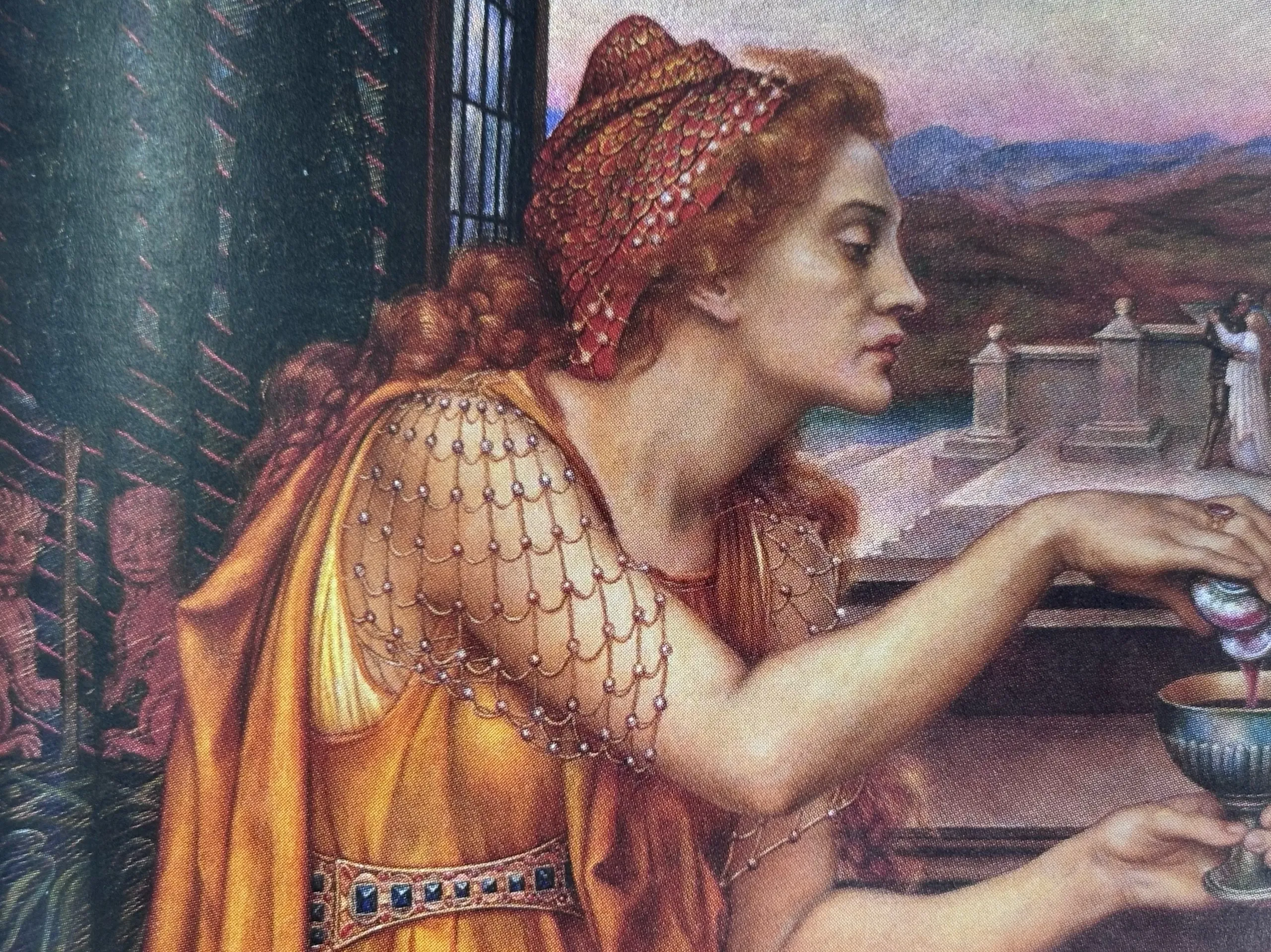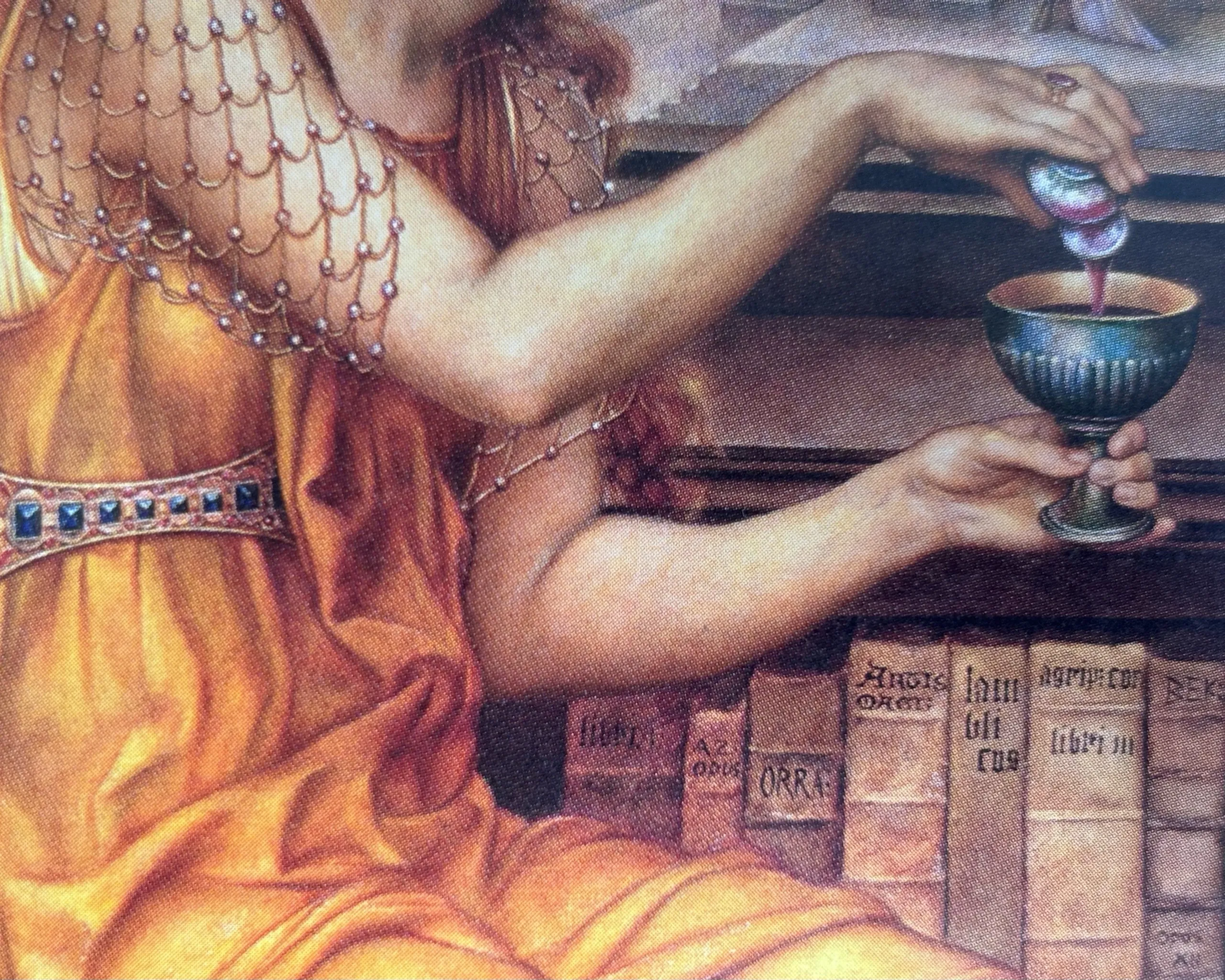 Я думаю, что нет. Героиню картины определенно нельзя назвать кроткой и покорившейся. Она играет активную роль в судьбе возлюбленных, изображённых на заднем плане. С помощью любовного зелья пара воссоединяется. А чтобы приготовить этот напиток, женщина использовала знания, полученные из научных и философских трактатов. В таком прочтении полотно олицетворяет тягу души к просвещению, ведь, по мнению художницы, в знаниях заключена активная созидательная сила.