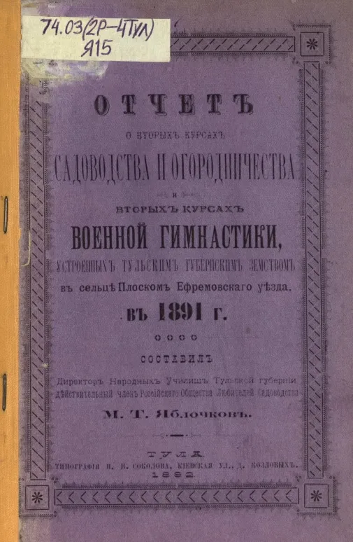Отчет о вторых курсах садоводства и огородничества и военной гимнастики, устроенных Тульским Губернским Земством в сельце Плоском Ефремовского уезда, в 1891 г. (Тула, 1892).
