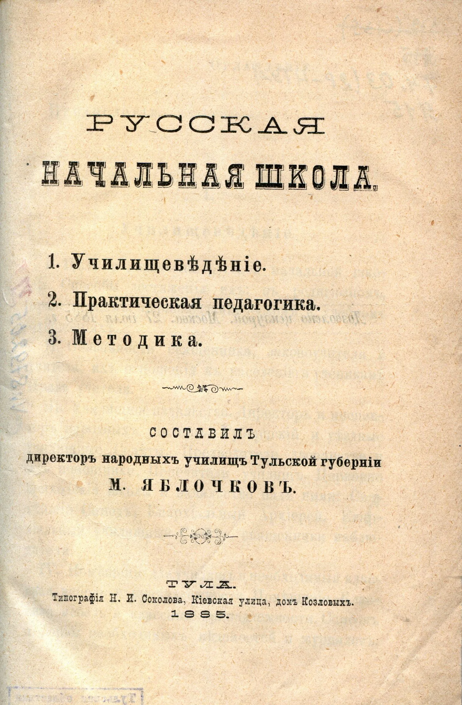 В 1885 году в тульской типографии Н. И. Соколова вышла книга «Русская начальная школа: наставления учителям начальных училищ Тульской губернии: 1. Училищеведение. 2. Практическая педагогика. 3. Методика»2.