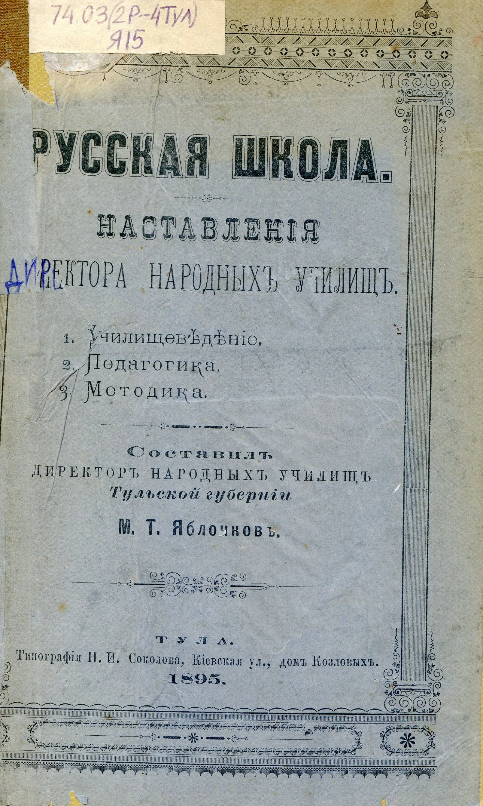 Яблочков, М. Т. Русская школа : наставления директора народных училищ : 1. Училищеведение. 2. Педагогика. 3. Методика / М. Т. Яблочков. – Тула : тип. Н. И. Соколова, 1894 (обл. 1895). – [2], IV, 346 с. – URL : http://opac.tularlic.ru/opacg/Skaner/2012-19/K38121.pdf (дата обращения: 18.03.2025).