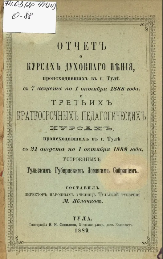 Курсы духовного пения проходили с 7 августа по 1 октября 1888-го, а краткосрочные педагогические курсы – с 21 августа по 1 октября того же года. Оба курса включали в себя теоретические и практические занятия, преподавалась методика воспитания и обучения различным предметам. Для курсов духовного пения также был составлен необходимый список нот, руководств и пособий, список авторов духовно-музыкальных сочинений. Все эти материалы вошли в опубликованный в 1889 году «Отчет о курсах духовного пения, происходивших в г. Туле с 7 августа по 1 октября 1888 года, и третьих краткосрочных педагогических курсах, происходивших в г. Туле с 21 августа по 1 октября 1888 года, устроенных Тульским Губернским Земским Собранием»9.