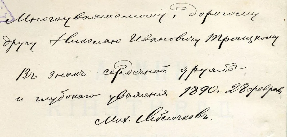 Автограф М. Т. Яблочкова, адресованный Н. И. Троицкому