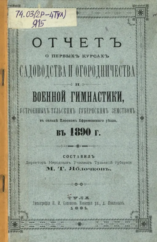 Отчет о первых курсах садоводства и огородничества и военной гимнастики, устроенных Тульским Губернским Земством в сельце Плоском Ефремовского уезда, в 1890 г. (Тула, 1891).