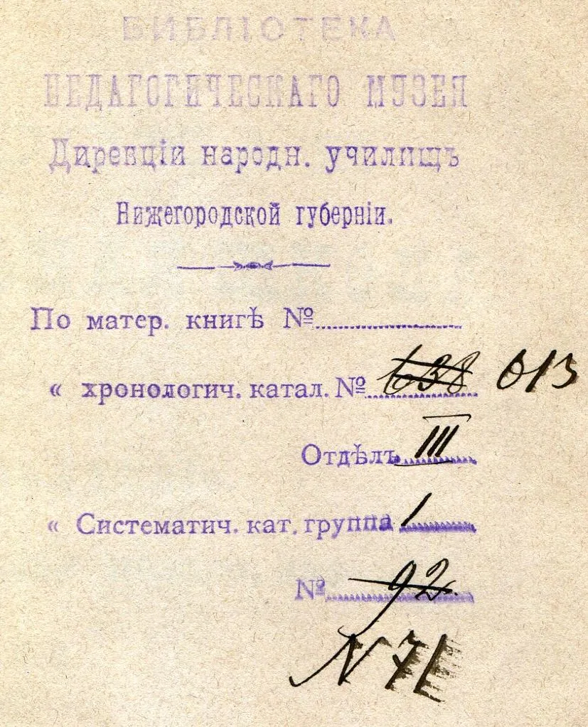 Интересно, что один из экземпляров издания из фонда ТОНБ имеет штемпель библиотеки Педагогического музея Дирекции народных училищ Нижегородской губернии.