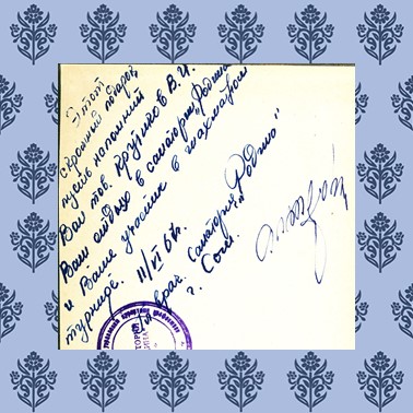 Автограф В. И. Крутикову от главного врача санатория «Родина» г. Сочи