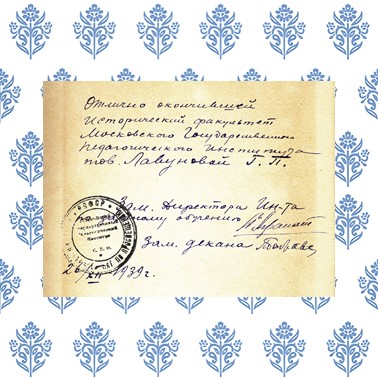 Автограф Г. П. Крутиковой (Лавуновой) от преподавателей Московского государственного педагогического института